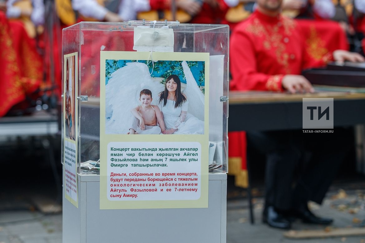 (Казань, 14 сентября, «Татар-информ», Оксана Романова). Сегодня в сквере у Татарской государственной филармонии им. Тукая прошел благотворительный концерт-эстафета, который помог собрать 59 тыс. рублей для больной раком Айгуль Фазыйловой, в одиночку воспитывающей сына-первоклассника.