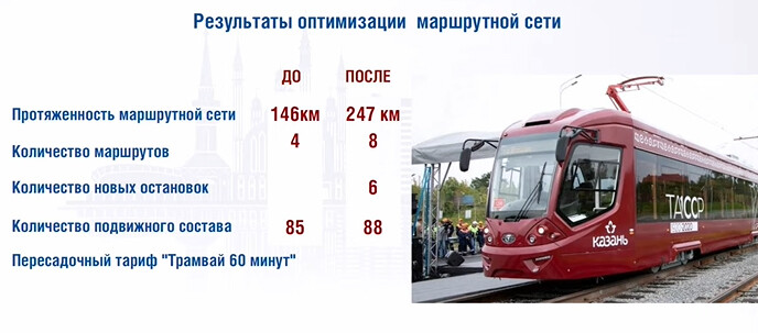 Заместитель руководителя Исполкома Казани Ильдар Шакиров добавил, что поводом для пересмотра действующей сети стали обращения жителей, а также анализ ее эффективности. «Было сделано несколько выводов: первый вывод заключается в неравномерности пассажирского трафика на разных участках кольца. Есть протяженные участки, где вагоны переполнены и высока потребность в увеличении количества рейсов, а есть участки, по которым трамваи идут полупустыми. Второй касается регулярности маршрутов. Имея в основе один протяженный маршрут, мы очень сильно зависим от дорожно-транспортной ситуации. Даже любая мелкая ситуация приводит к сбоям не на одном локальном участке, а для нескольких районов города», — отметил докладчик.