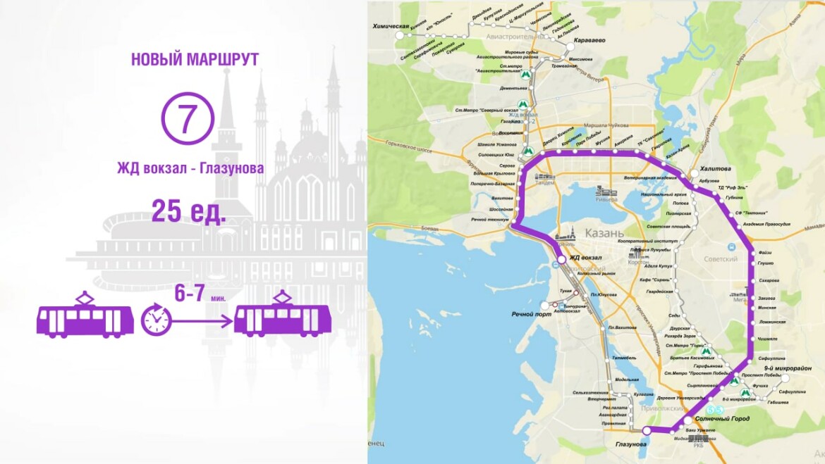 Наиболее загруженный участок от пр. Ямашева до пр. Победы будет усилен новым маршрутом — № 7. По нему будут ходить 25 вагонов с интервалом 6-7 минут. С учетом работы маршрутов № 5 и № 5а на данном участке суммарный интервал на маршруте составит 4-5 минут, что на 2 минуты меньше, чем сегодня.