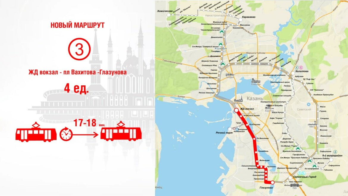 От остановки «Ж/д вокзал» до остановки «ул. Глазунова» будет также курсировать новый маршрут № 3. Будут ходить четыре вагона, которые дополнительно свяжут центральную часть города с промышленной и жилой зонами Приволжского района. С учетом работы здесь маршрутов № 5 и № 5а суммарный интервал составит 7-8 минут.