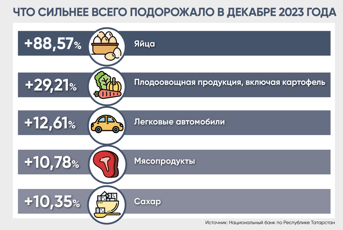 «Спрос на яйца оставался стабильно высоким. В декабре это позволило их производителям продолжить активный перенос в цены возросших ранее затрат. Среди них – расходы на импортное оборудование, корма и инкубационные яйца. Чтобы сохранить штат сотрудников, птицефабрики также повышали оплату труда», – объяснили очередной взлет цен на этот продукт в Нацбанке РТ.