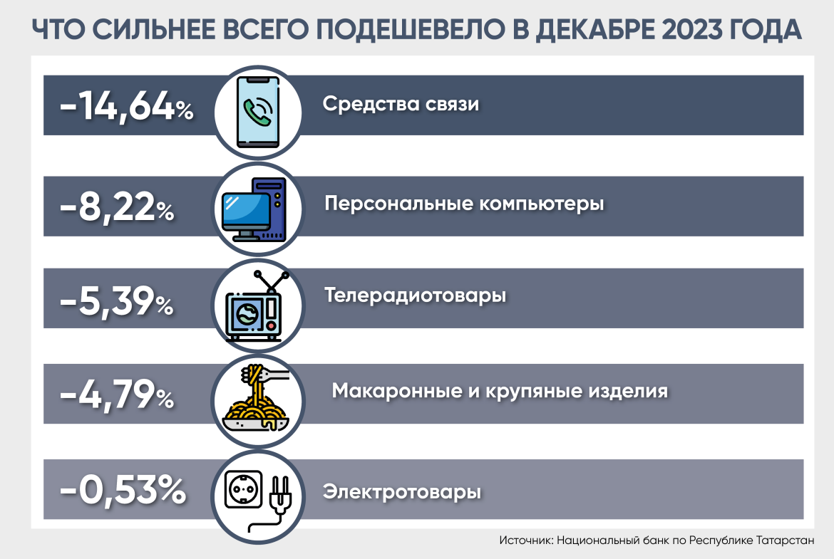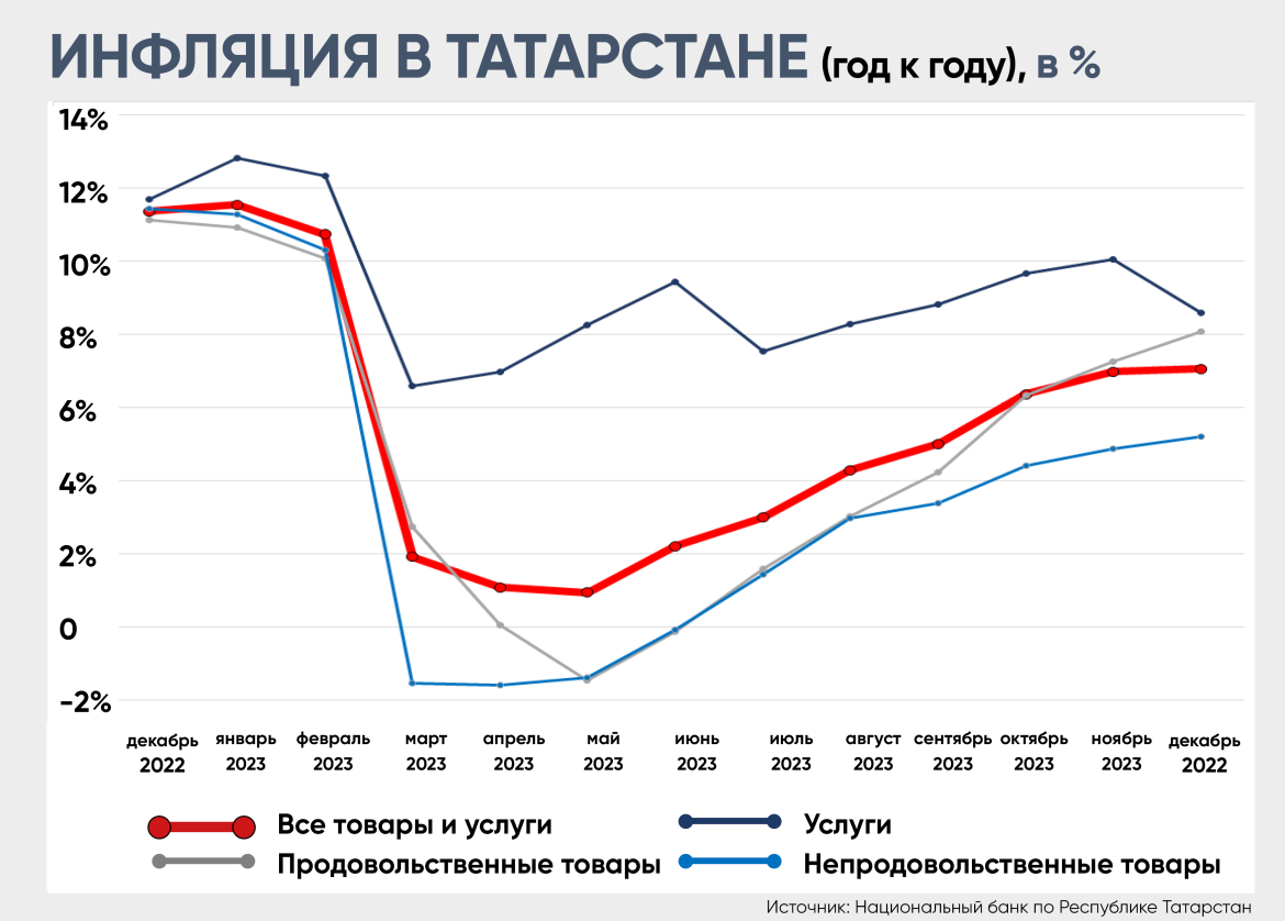 Замедление же инфляционной динамики в услугах связано с эффектом высокой сравнительной базы. Дело в том, что индексацию тарифов на коммунальные услуги Правительство РФ решило сделать в декабре 2022-го. А вот в декабре 2023-го тарифы не повышались. В результате по сравнению с ноябрем годовой прирост цен на ЖКУ снизился – в Татарстане до 3,9% (месяцем ранее было 9,8%), а по России и вовсе почти до нуля.