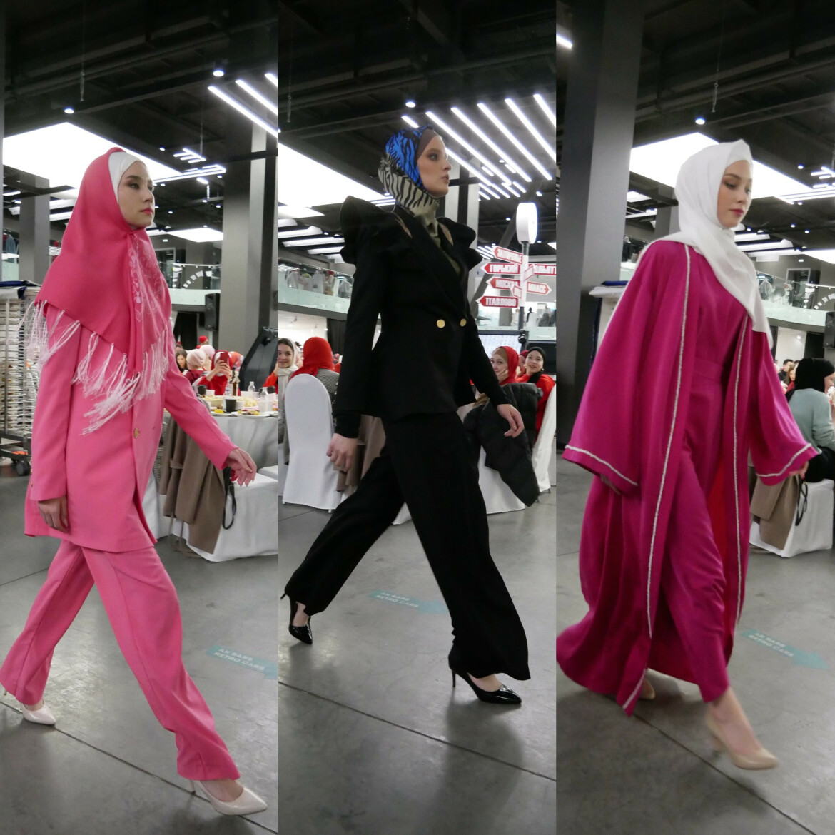 Не было никакой игры с формами, текстурой и цветом. Выделился лишь российский бренд ARGENTÜM, но они представили короткие кожаные куртки с плетеными, удлиненными деталями в актуальных сегодня розовом, оранжевом и грязно-сером цветах, но это как дополнение к образу. Хочется отметить пространство, которое собрало местных дизайнеров, что нас порадовало – это HS Club, как раз они и показали, что современная мусульманка может надеть и широкоплечий пиджак с брюками-палаццо, и брючный костюм в ярко-розовом цвете, и длинное кимоно в бахромах.