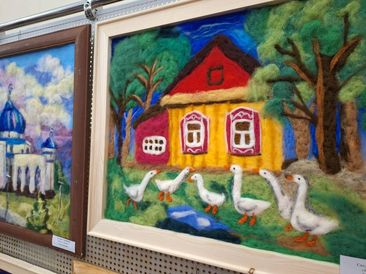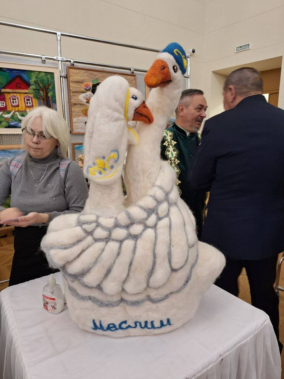 Рядом развернулась галерея из работ учеников Детской школы искуств Муслюмовского района, среди которых были картины из войлока, в том числе фигуры гусей из войлока в натуральный рост, изображения домов, возле которых пасутся гуси.