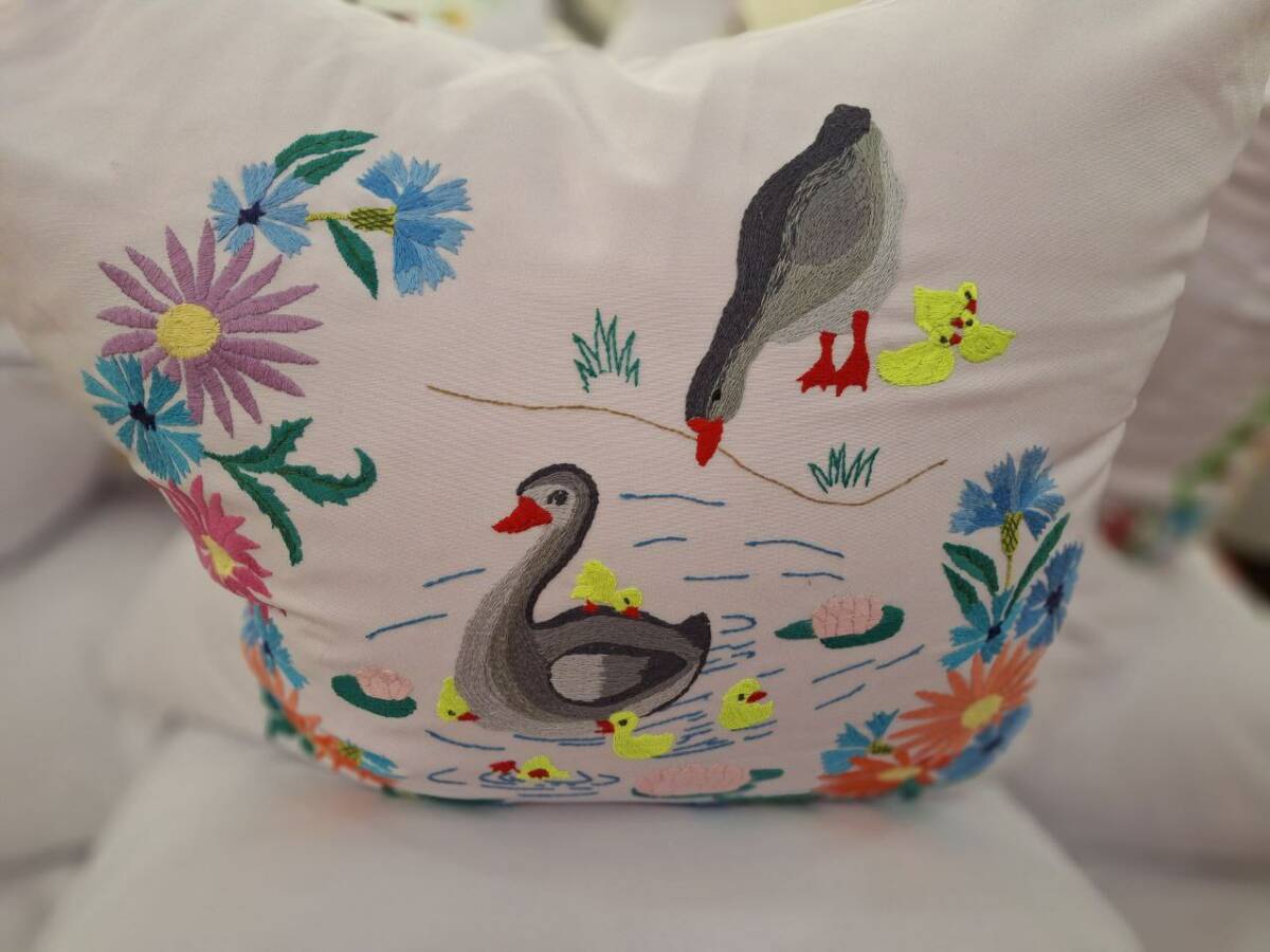 В центре фойе нашли свое место вышитые подушки с гусями. Они были вышиты местными мастерицами в рамках Всероссийского фестиваля «Каз өмәсе» (древний татарский обрядовый праздник), который уже несколько лет проходит в Муслюмовском районе.