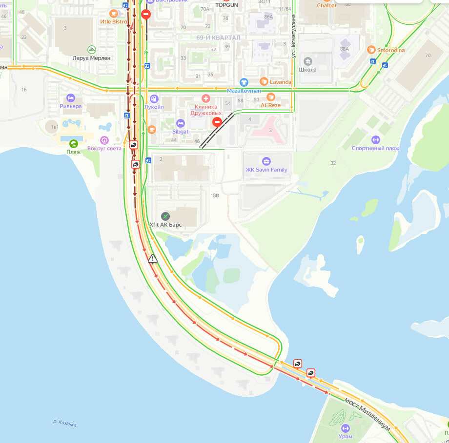 Дорожный затор с Миллениума до улицы Фатыха Амирхана серьезно затрудняет движение. Пропускная всего одна полоса, водители движутся очень медленно.