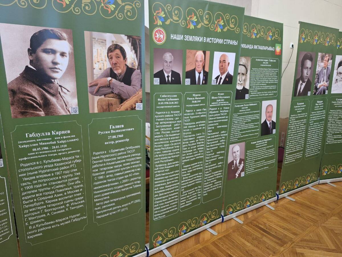 Здесь же развернулась выставка «Ил тарихында якташларыбыз» («Наши земляки в истории страны»). К примеру, в селе Кульбаево Мараса Нурлатского района родился основатель татарского театра Габдулла Кариев.
