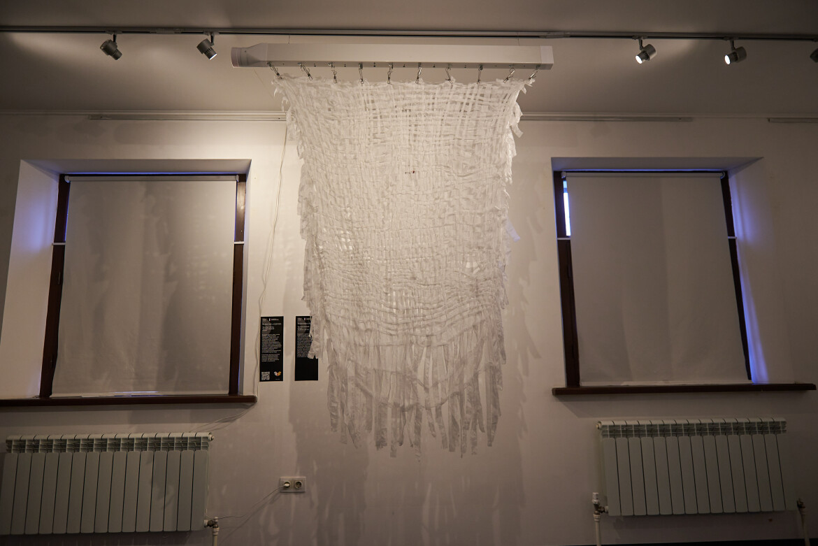 Работа слабослышащей художницы Валентины Андреевой «Ткань слуха» наглядно показала, как люди с особенностями здоровья воспринимают мир. Арт-объект выполнен из нежной ткани, в которой виднеются отверстия.