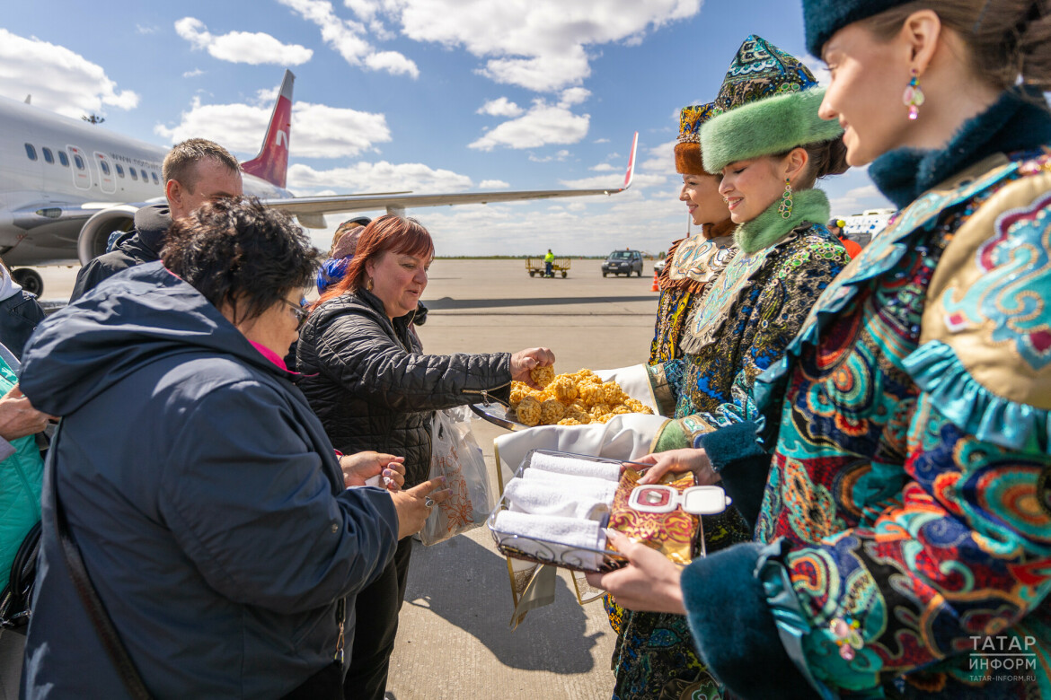 По традиции авиаторов, воздушное судно встретили красиво – после приземления самолет проехал под водяной аркой, созданной на рулежной дорожке с помощью брандспойтов пожарных автомобилей. Затем состоялась церемония перерезания красной ленточки, а после прибывших первым рейсом пассажиров встретили девушки в национальных татарских костюмах и угостили их чак-чаком.