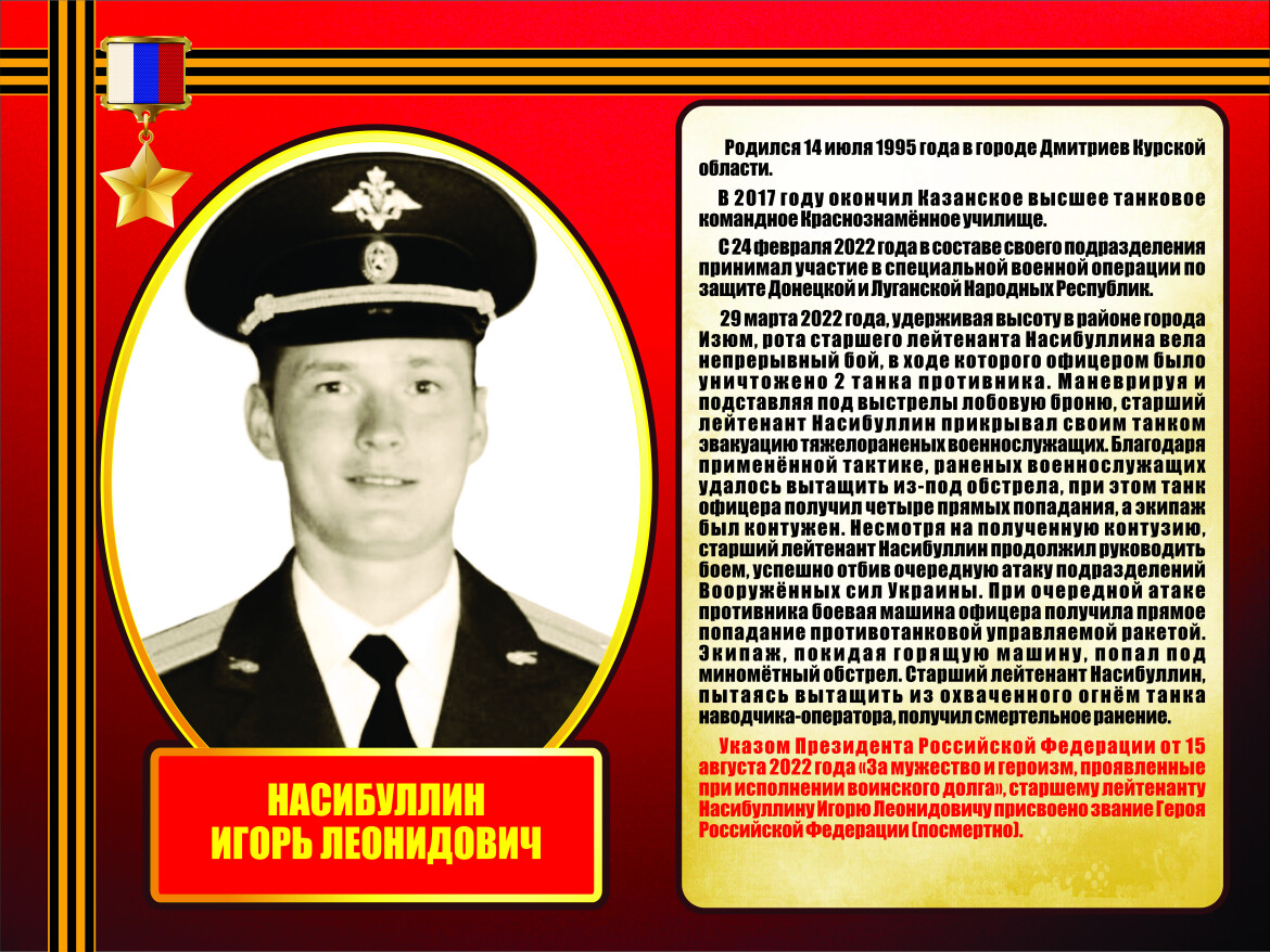 В начале сентября стало известно, что за подвиги в спецоперации на Украине звания Героя России был удостоен еще один выпускник Казанского танкового училища – Игорь Насибуллин. Он родился 14 июля в Курской области в городе Дмитриев.