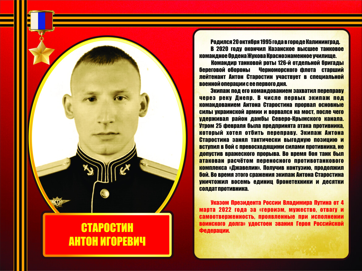 В военной спецоперации на Украине Старостин принимает участие с самого начала. К этому времени молодой офицер дослужился до командира танковой роты 126-й отдельной бригады береговой обороны Черноморского флота.