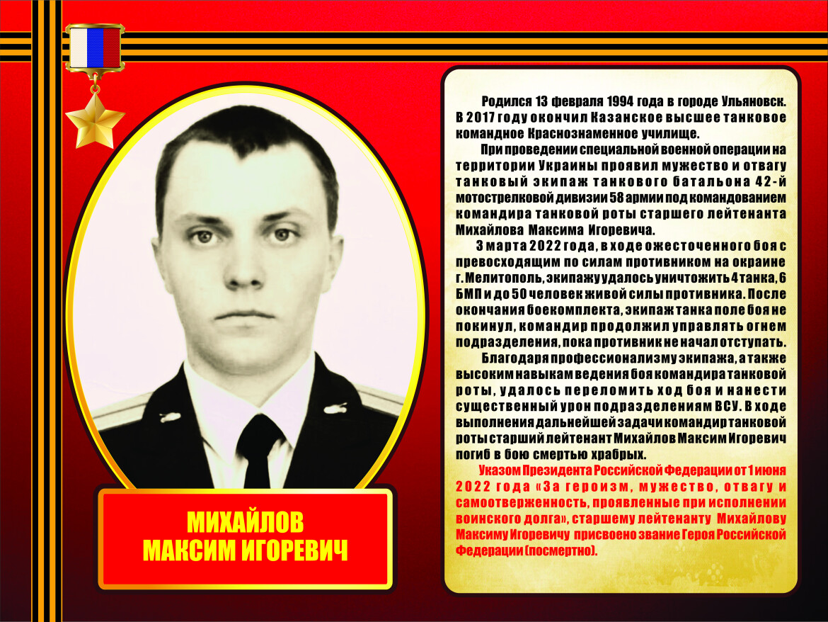 В июне звание Героя России за подвиги в спецоперации на Украине получил еще один выпускник Казанского танкового училища – командир танковой роты старший лейтенант Максим Михайлов. Он родился в Ульяновске 13 февраля 1994 года.