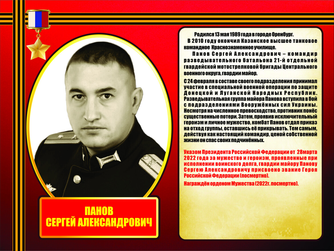 В зоне спецоперации Сергей Панов служил командиром разведывательного батальона 21-й отдельной мотострелковой бригады Центрального военного округа. 4 марта его группа вступила в неравный бой с противником. В какой-то момент майор отдал своим товарищам приказ отступить, а сам остался их прикрывать. Увы, выжить командиру батальона не удалось.