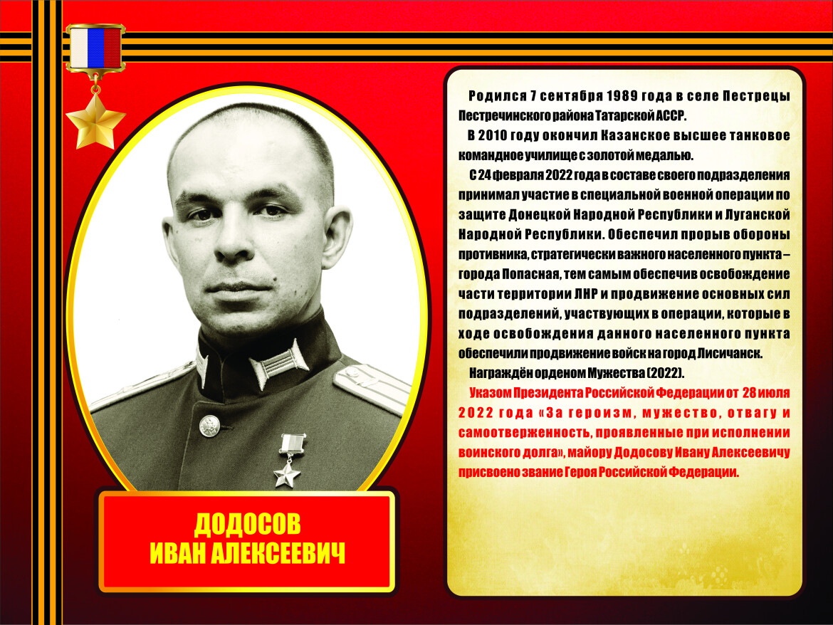 Иван Додосов родился 7 сентября 1989 года в селе Пестрецы. Военный вуз татарстанец окончил с золотой медалью. Командир танкового батальона воинской части Новочеркасского гарнизона Южного военного округа принимал участие в СВО с самого начала.