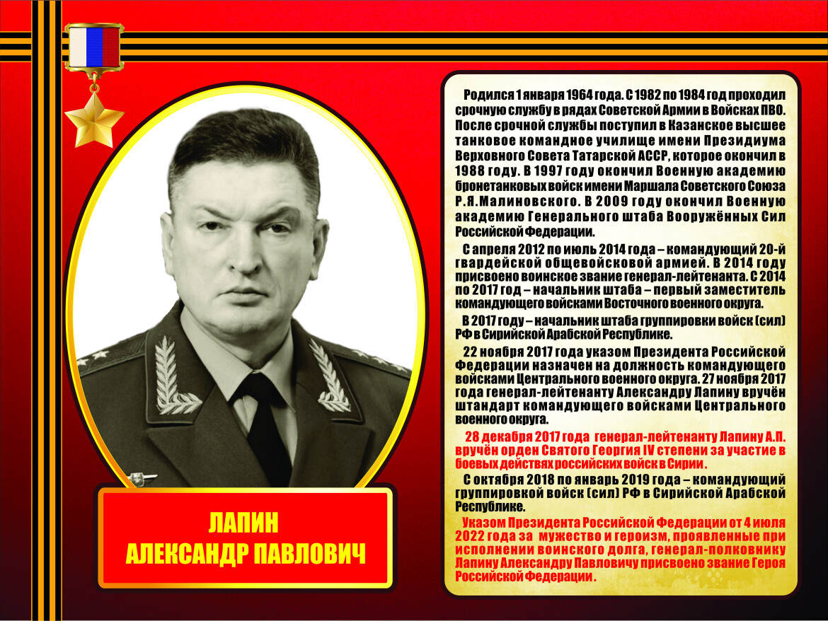 Генерал-полковник Александр Лапин – один из самых выдающихся выпускников Казанского танкового училища. Он родился 1 января 1964 года в Казани. Прежде чем поступить в военный вуз, Лапин прошел срочную службу в рядах Советской армии.