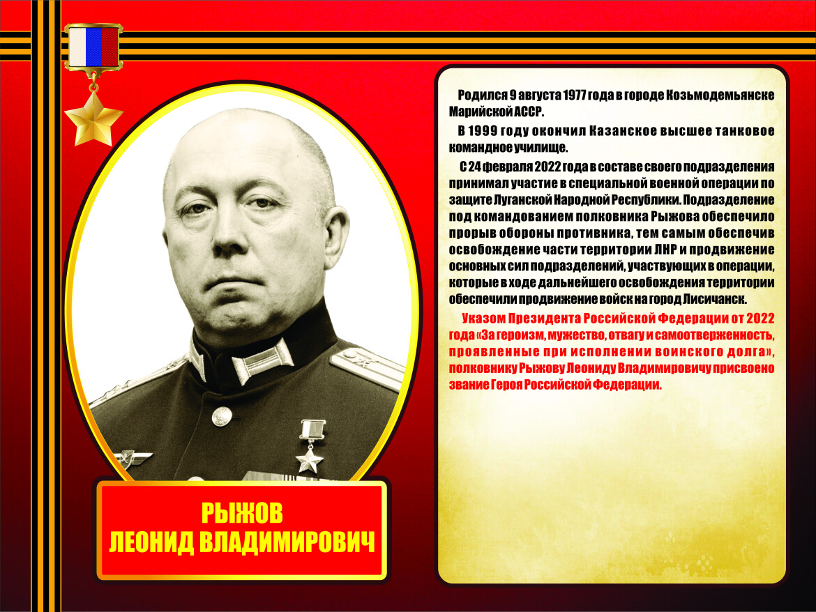 Начальник управления 8-й гвардейской общевойсковой армии Южного военного округа Леонид Рыжов родился 9 августа 1977 года в Республике Марий Эл в городе Козьмодемьянск. В 1999 году он окончил Казанское танковое училище, после чего был направлен в Сибирский военный округ, где служил командиром танкового взвода.