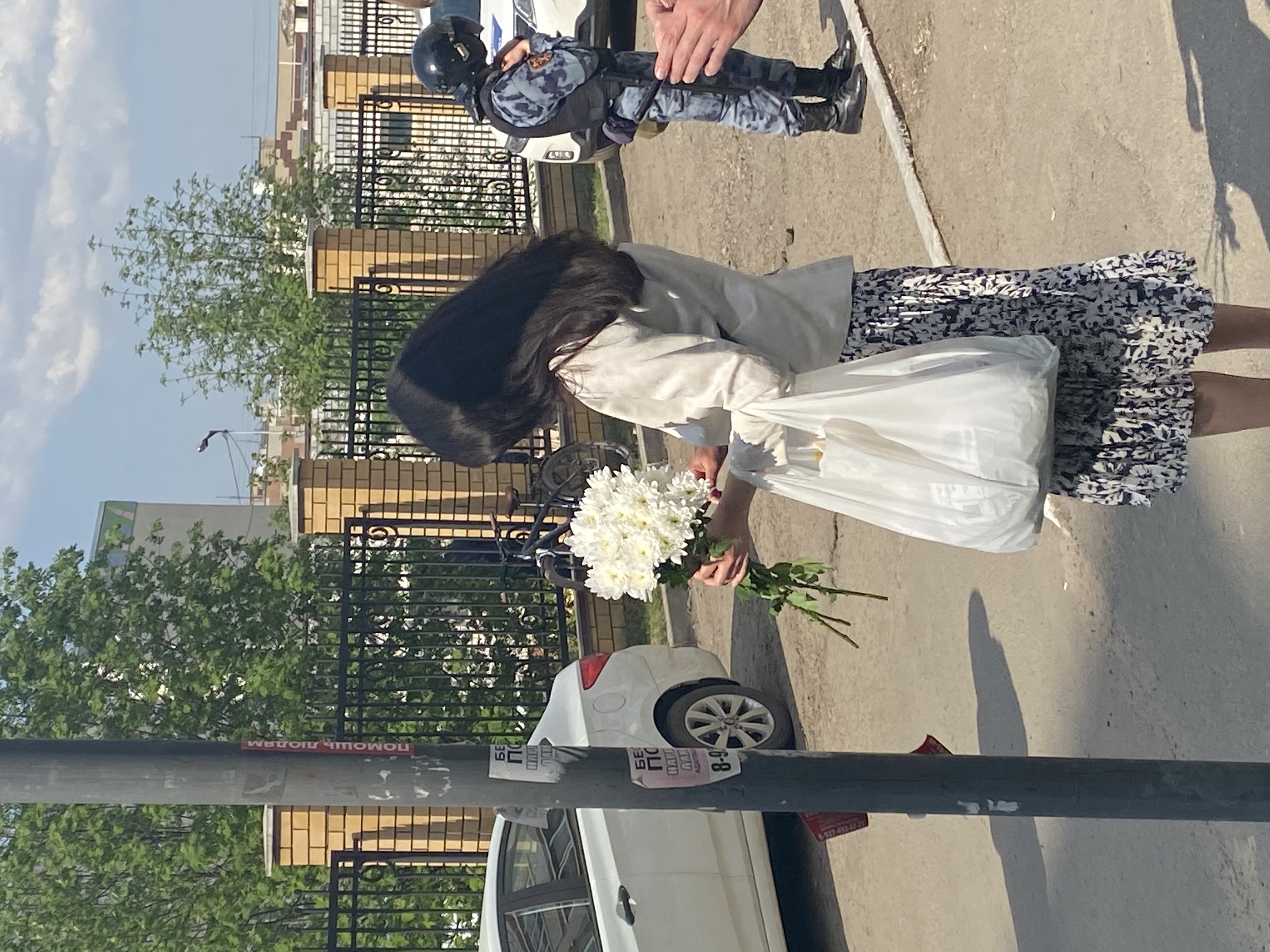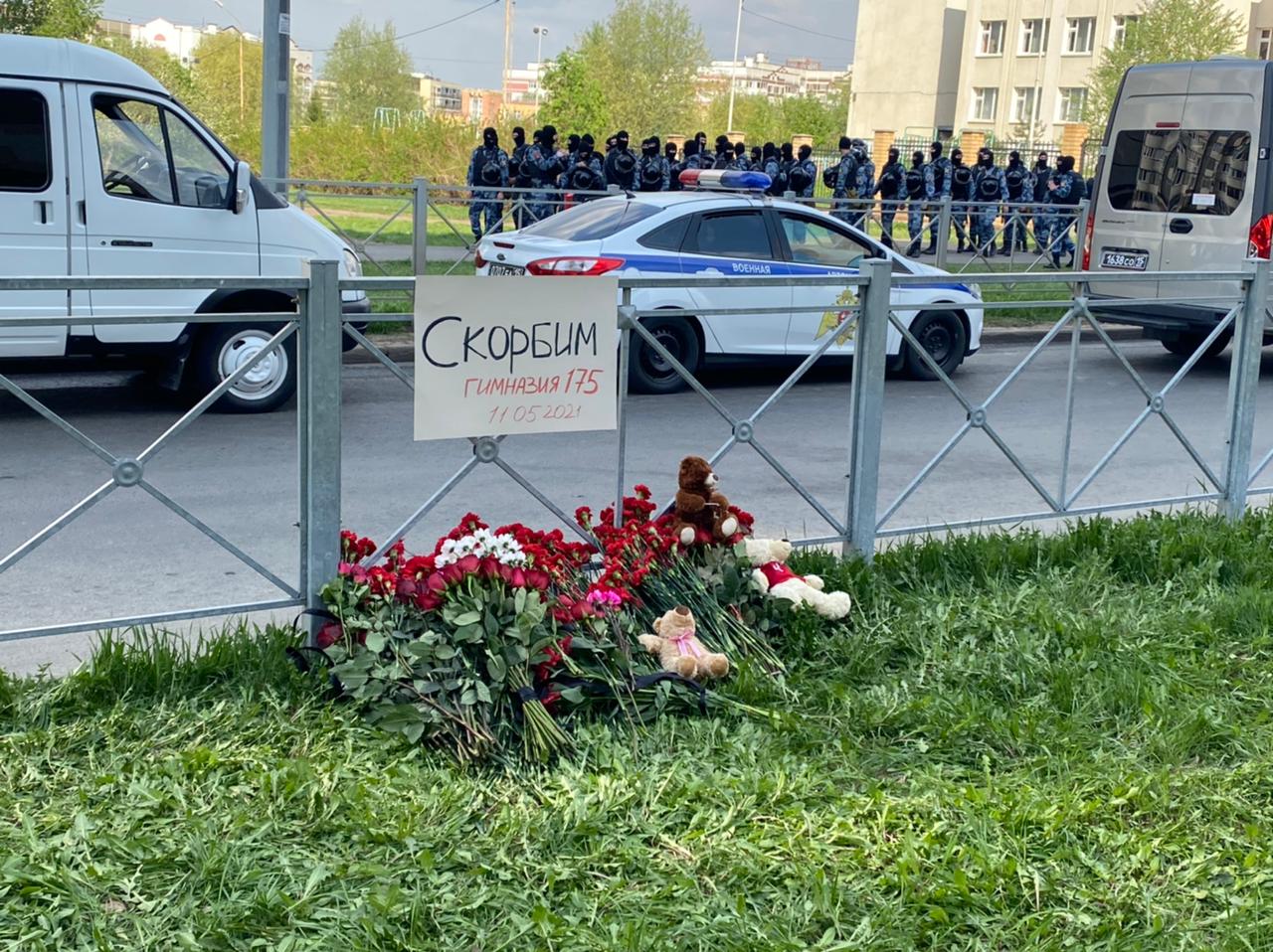 До этого напротив школы был организован еще один своеобразный мемориал с надписью «Скорбим, Гимназия 175, 11.05.2021». Сюда приходят очень много неравнодушных людей, которые узнали о трагедии в соцсетях, они приносят цветы и игрушки.