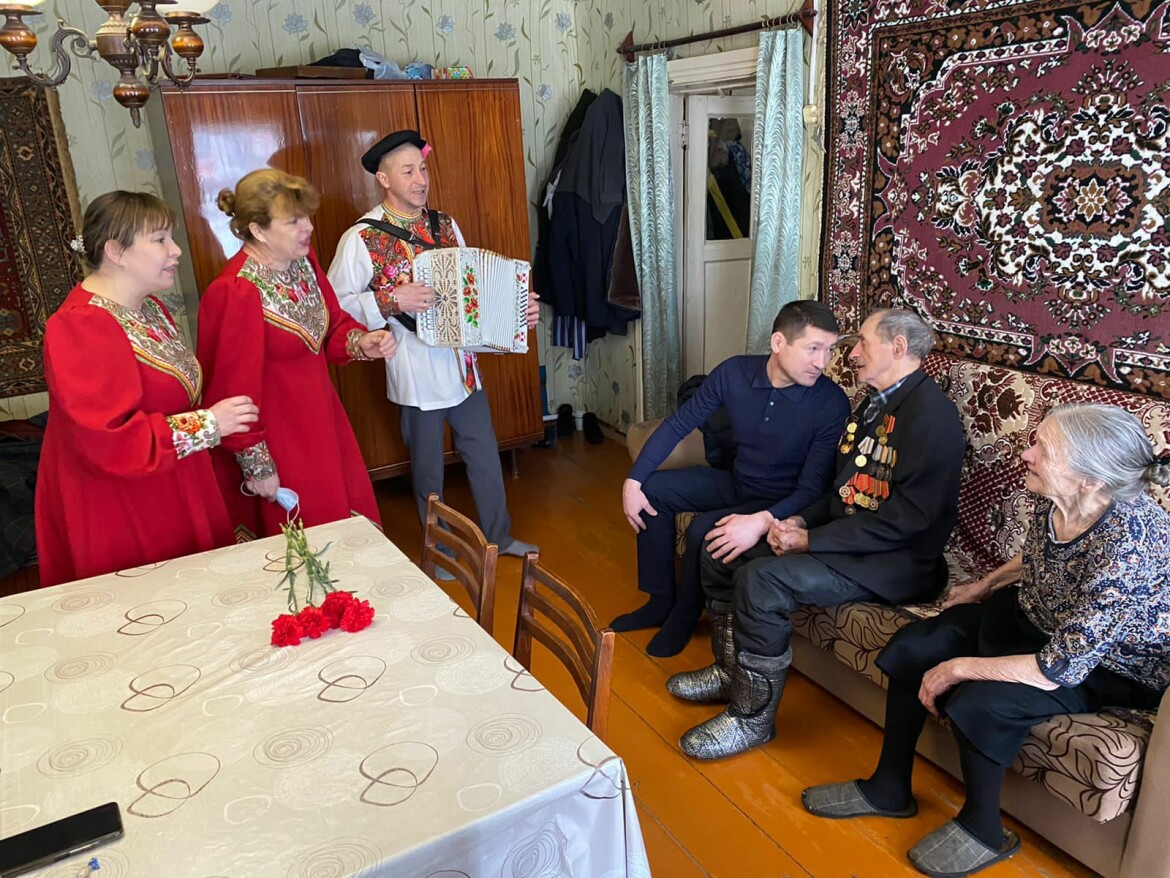 Глава Пестречинского района Татарстана Ильхам Кашапов и вокально-инструментальный ансамбль «Селяне» навестили участника Великой Отечественной войны Алексея Макарова на дому. 95-летний ветеран вместе с супругой живет в селе Новое Шигалеево.