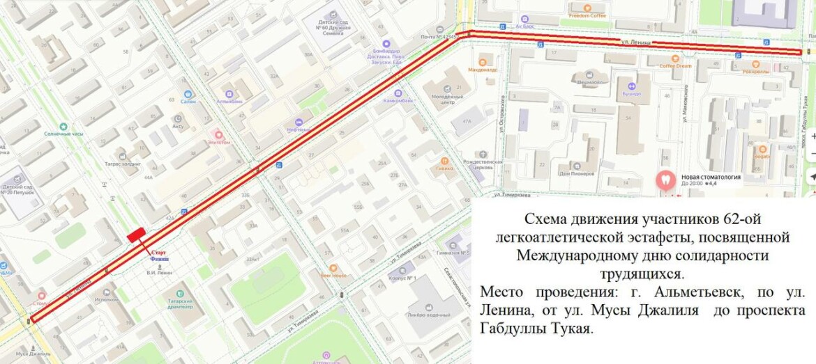 1 мая на улицах Альметьевска пройдет 62-я легкоатлетическая эстафета, посвященная Международному дню солидарности трудящихся. В связи с этим будет ограничено движение по улице Ленина от ул. Мусы Джалиля до проспекта Тукая. Об этом сообщает администрация района в своем Telegram-канале.
