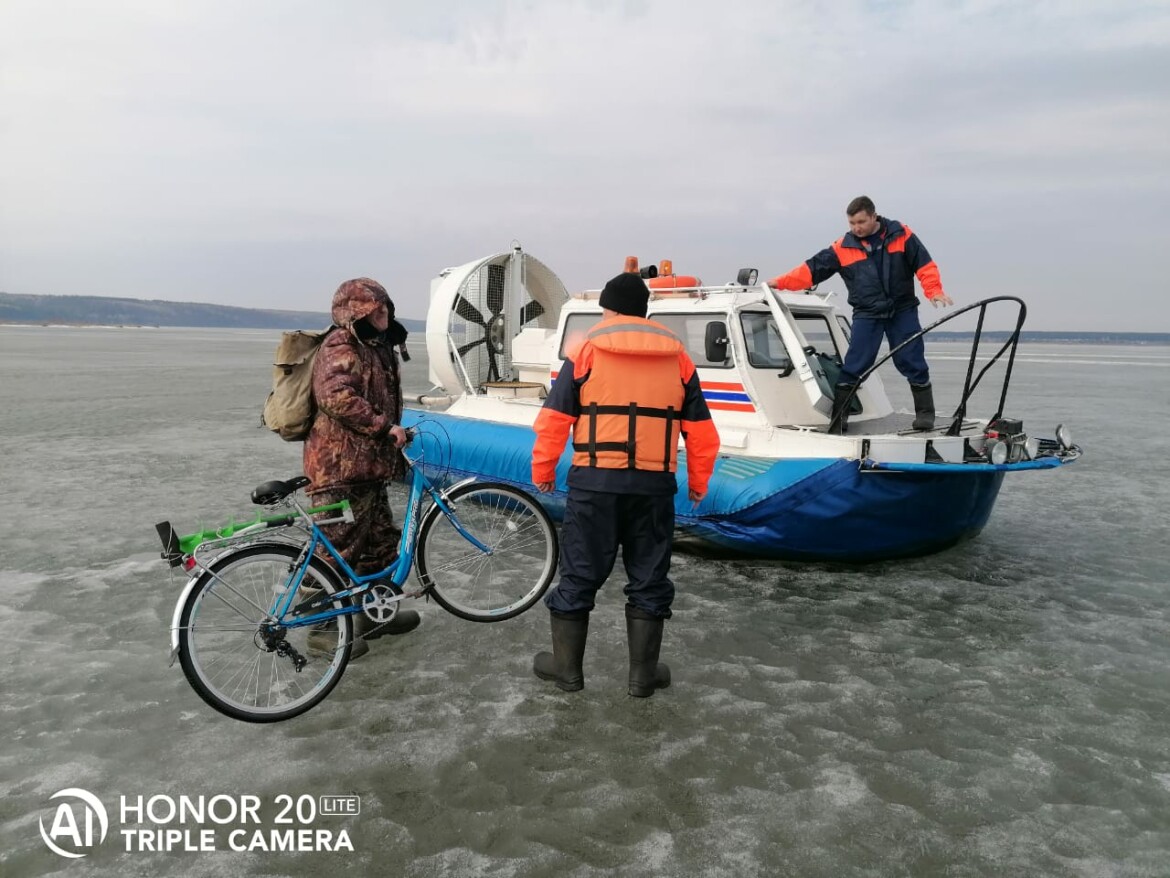 Спасатели на судне на воздушной подушке доставили нескольких рыбаков на берег. Один из любителей подледной рыбалки даже приехал к месту лова на велосипеде.