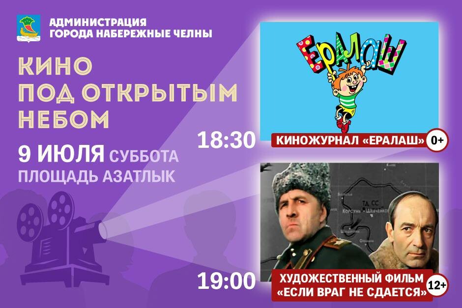 В эту субботу, 9 июля, зрители увидят советскую военную драму «Если враг не сдается...» с Валентином Гафтом. Перед показом самой картины юным зрителям предложат посмотреть «Ералаш» и мультфильмы. Кинопоказы завершатся в августе ежегодным большим Всероссийским фестивалем уличного кино.