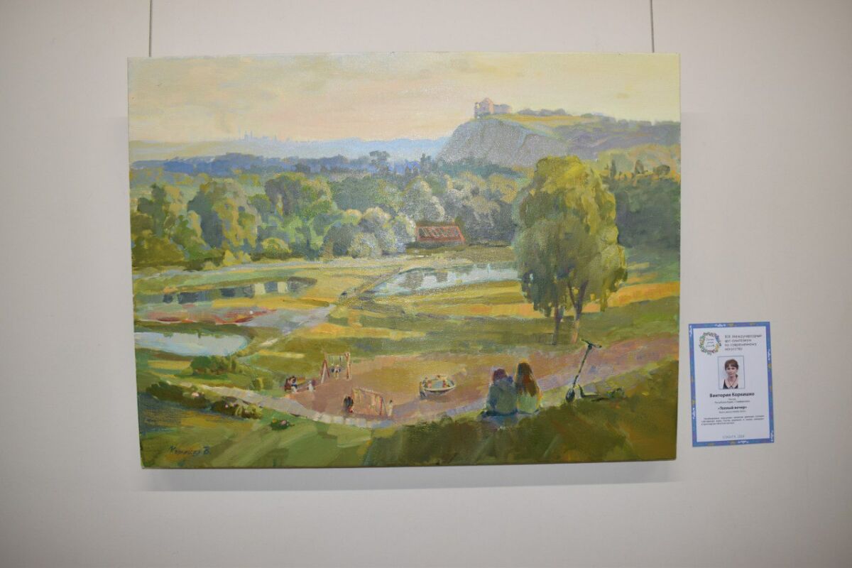 Еще одна художница Виктория Коркишко из Республики Крым, принимающая участие в симпозиуме впервые, изобразила на своей работе теплый летний вечер на елабужских Шишкинских прудах с гуляющими со своими родителями детьми.