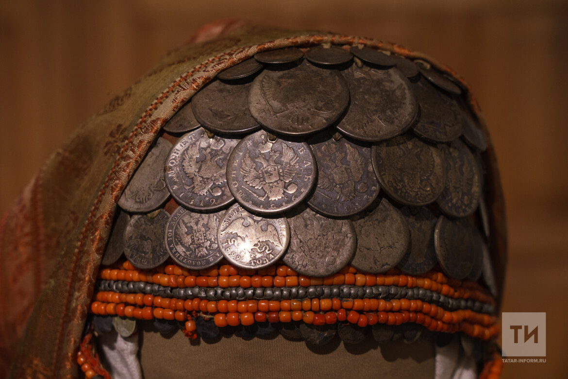 В аутентичном костюме присутствует головной убор, украшенный монетами екатерининского времени