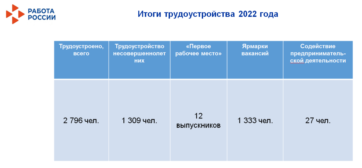 За прошлый год трудоустроено 2796 человек. Доля трудоустроенных среди граждан, обратившихся в поиске подходящей работы, в 2022 году составила 47,3%, в 2021 году этот показатель равнялся 45,7%.