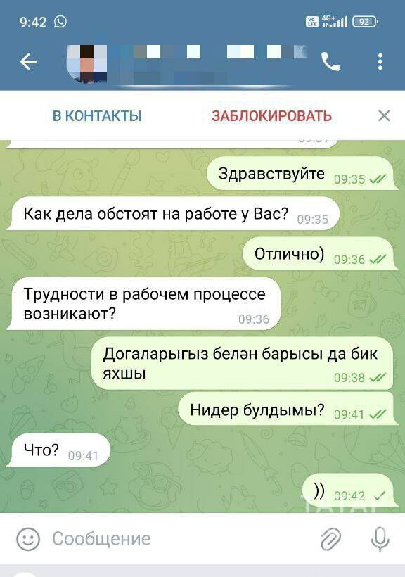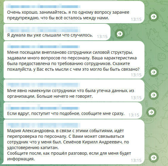 Сообщение мошенник начал с расспросов о работе, затем написал: «Я заранее предупреждаю, чтобы все осталось между нами. Я думала, вы уже слышали, что случилось. Меня посещали внепланово сотрудники силовой структуры, задавали много вопросов по персоналу. Ваша характеристика была предоставлена по требованию сотрудников. Скажите, пожалуйста, у Вас есть мысли, с чем это могло бы быть связано?»