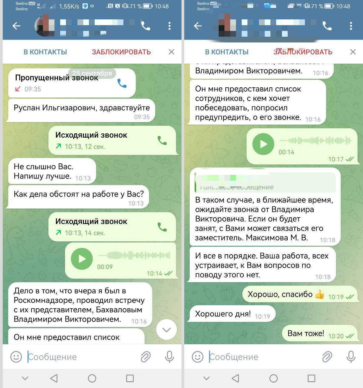 «Он мне сначала позвонил, но я не разобрал, что он говорит, попросил написать. Он мне начал говорить, что был в Роскомнадзоре и там ему предоставили список сотрудников, в котором было и мое имя. Якобы там хотели со мной побеседовать. Он предупредил, что мне позвонят от некого Владимира Викторовича», – рассказал Руслан.