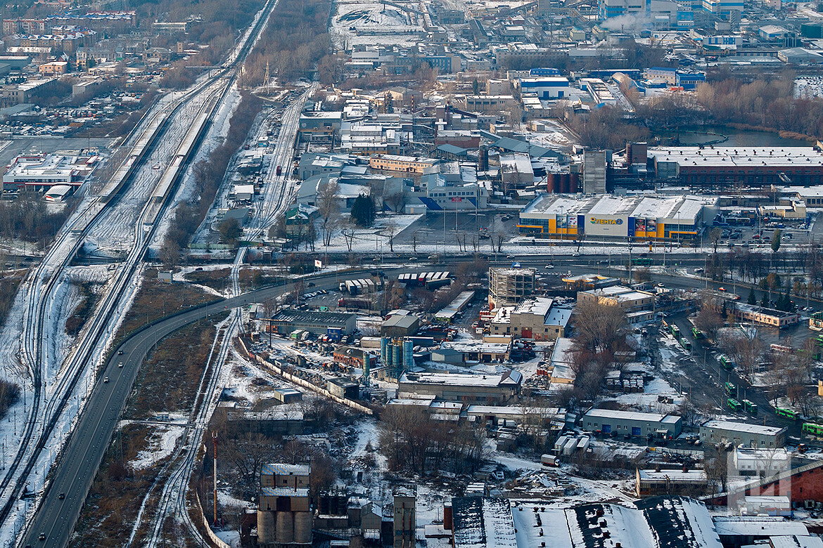 На месте будущей застройки (в нижней половине фотографии) находятся в основном промышленные постройки и склады, а также санитарно-защитная зона троллейбусного депо №1