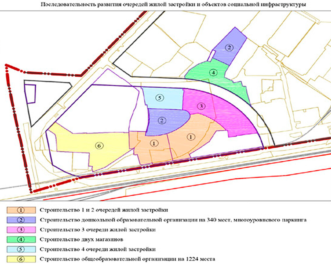 Всю территорию планируется освоить в четыре этапа. Однако в плане есть ссылка на то, что с «Российскими железными дорогами» еще предстоит согласовать санитарный разрыв, ведь застройка приблизится к ж/д путям.