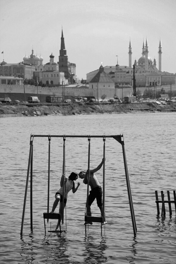 5. Вода в Волге иногда уходит, иногда, наоборот, прибывает, и тогда ее становится слишком много, как на этой фотографии. Любовная картинка на фоне города: вода затопила качели, на которых виснут юноша и девушка. Качели ведь тоже некий символ жизни, бросающей нас из стороны в сторону. Здесь качели пока идут в любовном направлении.