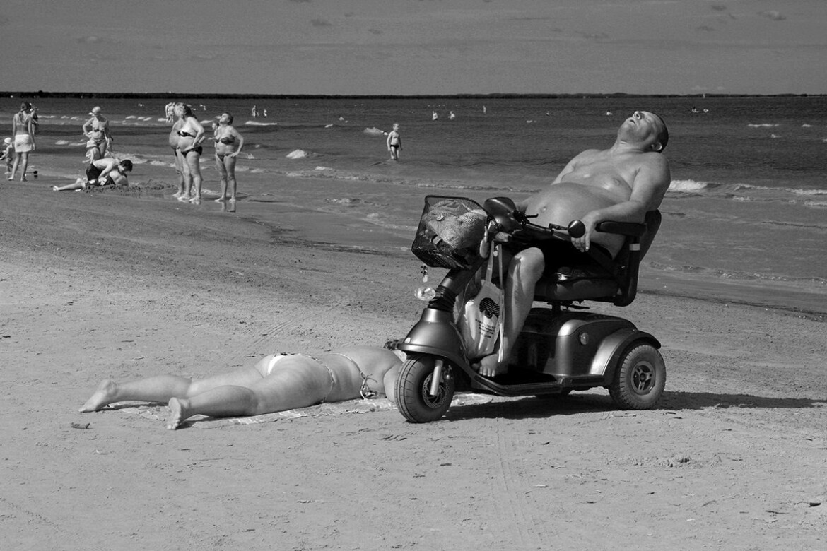 8. Юрмала, санаторий, Балтийское море. Кто-то выехал на берег на скутере и, не сходя с него, загорает. Здесь мне интересно состояние человека, который захотел выделиться из толпы, купив такое необычное средство передвижения и приехав на нем на пляж. Видно, что он доволен жизнью.