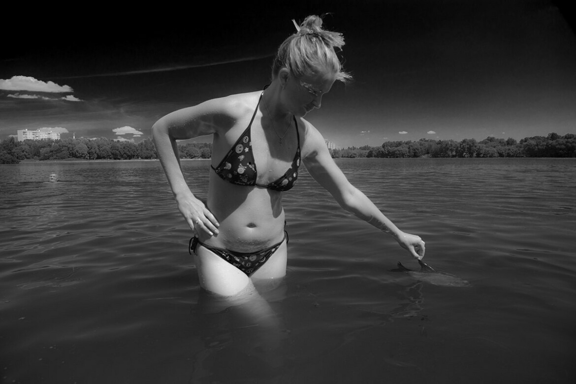 2. Тоже Долгопрудный, водохранилище, девушка держит за плавник рыбу. Мысленно я назвал эту фотографию «Прогулка с рыбкой». Кто-то выводит на прогулку собачек, а здесь девушка прогуливается с рыбой. На этом снимке тоже контакт двух миров – подводного и надводного, реального для нас. Эти миры граничат, но под водой, как известно, другие правила.