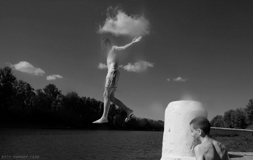 7. Это из другой небольшой серии — «Как сон». Снято с фильтром, делающим часть изображения нерезким. Мальчик прыгнул с тумбы причала, в этот момент я нажал кнопку. И получилась сюрреалистическое изображение с иллюзией хождения по воздуху или по невидимому канату.