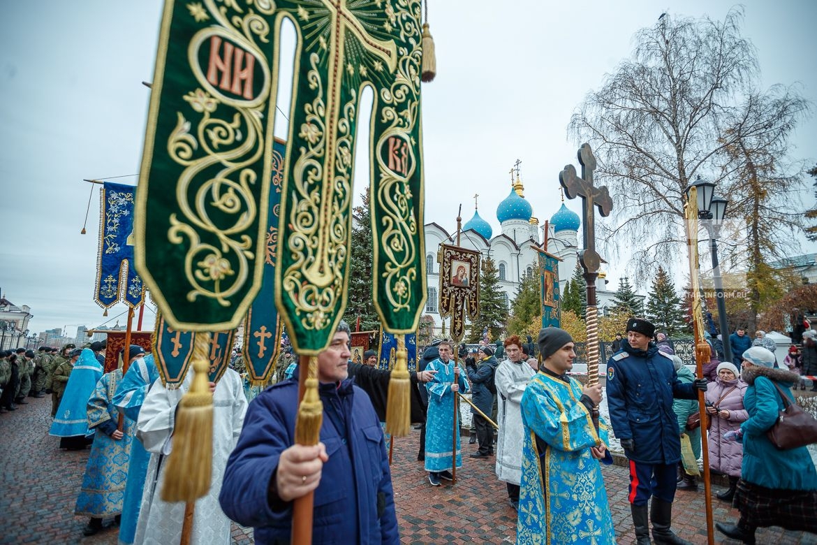 (Казань, 4 ноября, «Татар-информ», Ксения Перепеченова). В столице Татарстана состоялся традиционный крестный ход от Благовещенского собора Казанского Кремля к месту обретения чудотворного образа Казанской Божией Матери. Процессию верующих возглавил митрополит Казанский и Татарстанский Феофан. Шествие завершилось молебном на территории Казанского Богородицкого монастыря у воссоздаваемого собора Казанской иконы Божией Матери. Митрополит отметил, что храм был построен менее чем за 3 года силами многих благотворителей и при поддержке татарстанских властей.