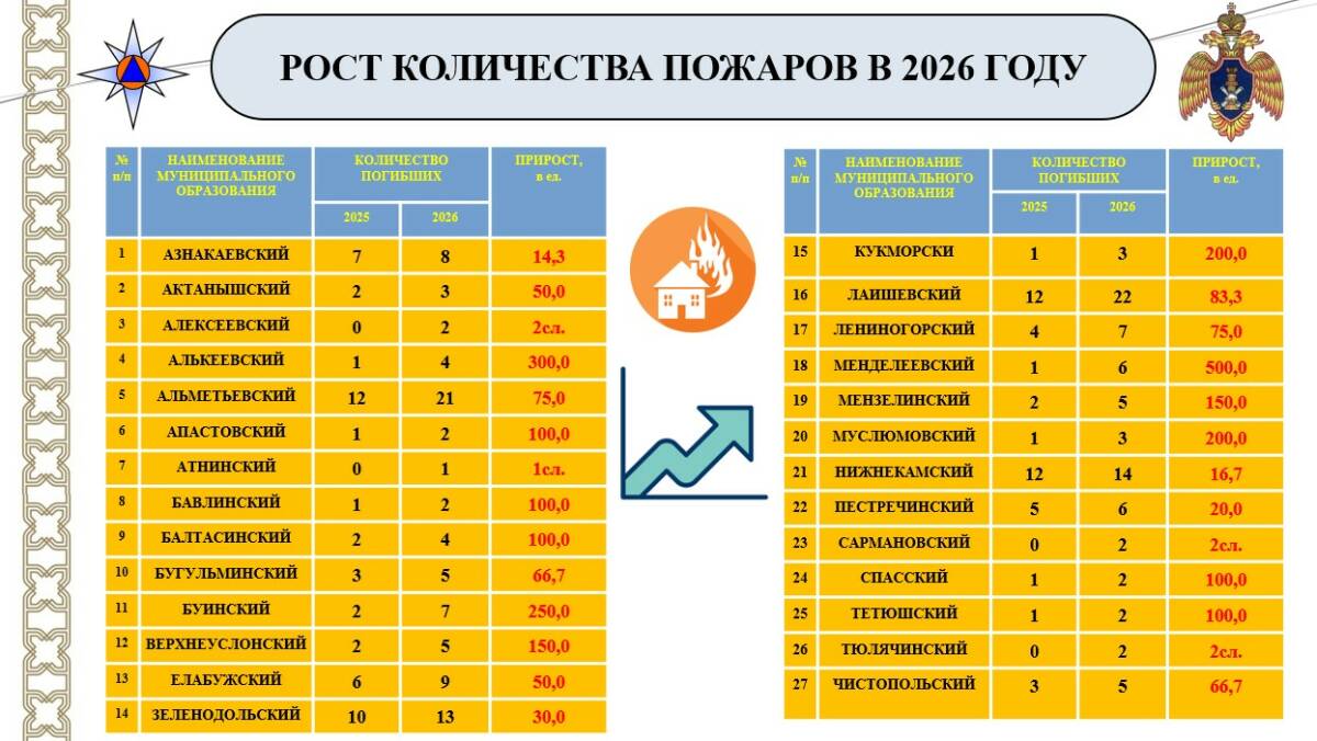 Рост числа погибших зафиксирован в 11 районах республики. Самые большие пожары произошли в Елабужском, Зеленодольском, Альметьевском районах, а также в Казани.