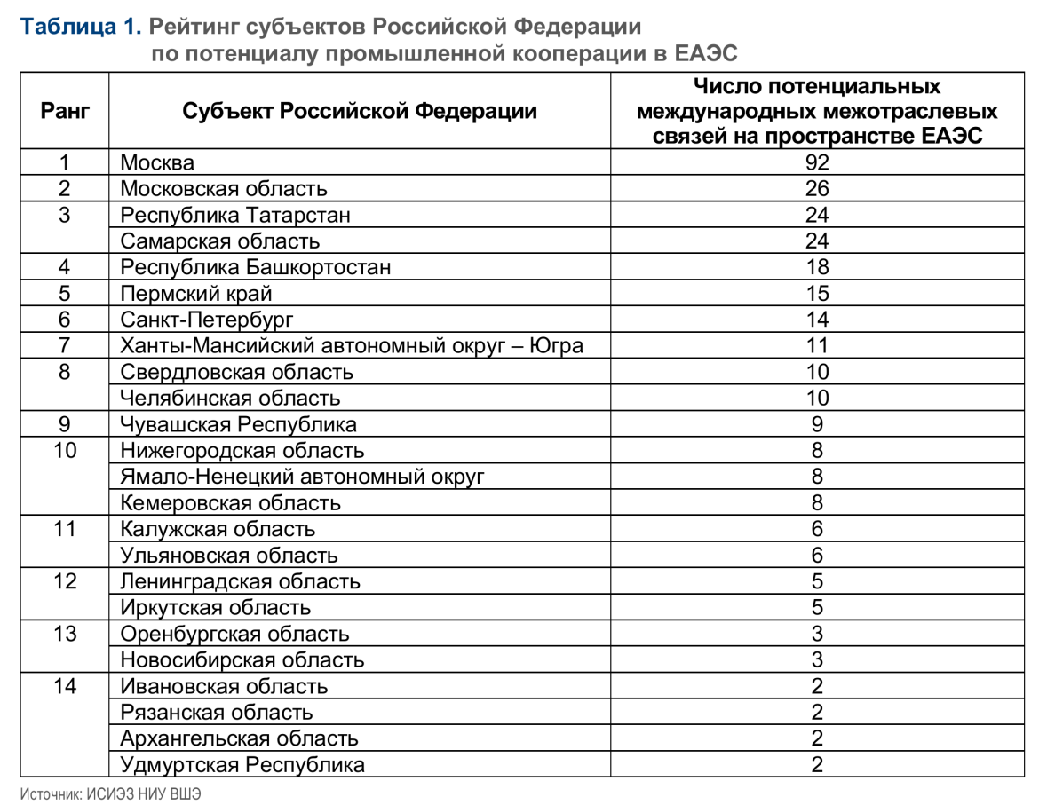 Среди общих приоритетов – развитие транспортно-логистический связанности, финансовых рынков, продовольственная безопасность, а также промышленная кооперация и совместные проекты. Еще весной на Интеграционном форуме РСПП президент РСПП Александр Шохин призывал к этому партнеров: «Мы не призываем обходить санкции, а использовать те ниши, которые возникают в связи с уходом западных партнеров из России. Безусловно, не только российские компании могут эти ниши занимать, но и компании стран – членов ЕАЭС» (цитата по Reuters). Понятно, что про ниши лучше всего знают на уровне регионов, в этой связи актуальность исследования под названием «Региональный потенциал промышленной кооперации в ЕАЭС», которое ИСИЭЗ НИУ ВШЭ выпустил в августе, не представляет сомнений.