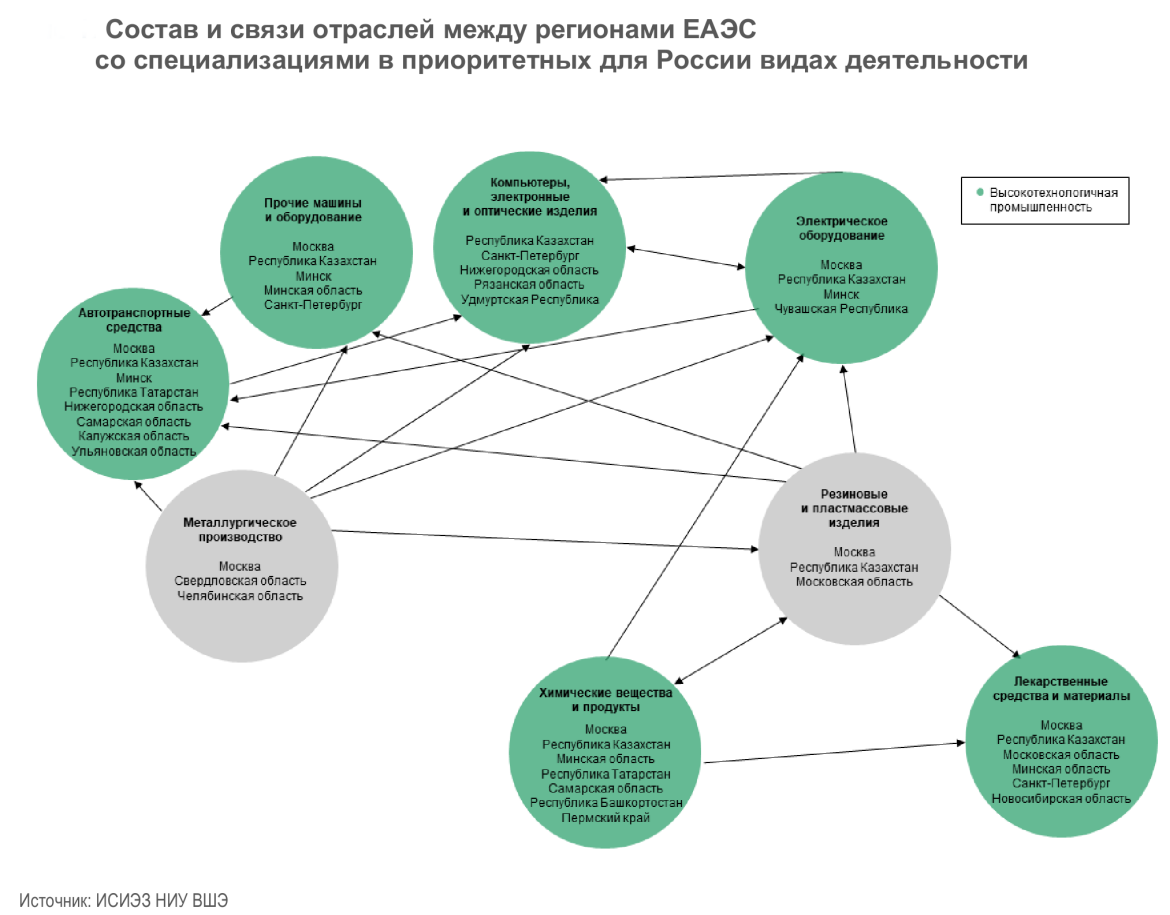Дальше надо было выявить «комплементарные виды деятельности», или потенциальные парные связи между регионами России, в частности Татарстаном, и регионами в странах ЕАЭС. Для этого эксперты ВШЭ проанализировали межотраслевые балансы, или материальные перетоки, воспользовавшись доступными данными Организации экономического сотрудничества и развития (ОЭСР). Эта матрица была «наложена» на возможные отношения и внутри Евразийского союза. Дело в том, что крупные отрасли обычно генерируют значительное число смежных производственно-технологических цепочек.