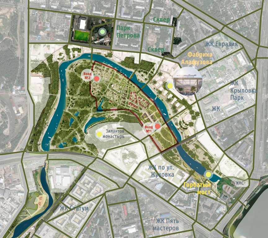 Одним из ключевых условий при создании парка стало сохранение историко-культурного окружения. Разработчики учли интересы расположенного поблизости Зилантова монастыря – в проекте не предусмотрены шумные аттракционы и развлекательные объекты, способные нарушить спокойствие территории.