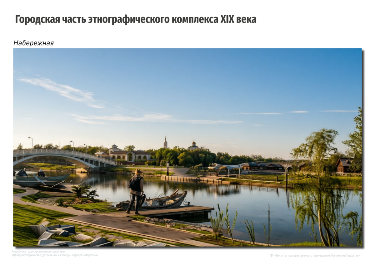 Концепция этнопарка – полифункциональная рекреационная зона нового формата. Григорьев пояснил, что проект важно не воспринимать как «деревню» – это некий образ татарской казанской слободы, отражающий превращение Казани из села в город. В истории столицы таких слобод было достаточно много: Адмиралтейская, Ягодная, Суконная – территории, которые постепенно меняли облик от сельских домиков до полноценной городской застройки.