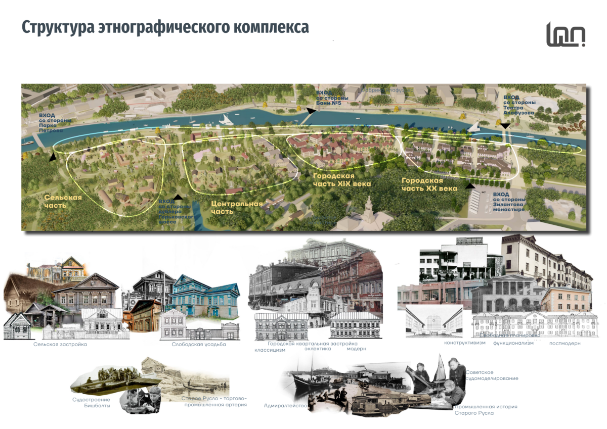 Проект станет неким путешествием во времени. В одном конце парка разместится сельский ландшафт с деревенскими домиками, а при перемещении в другой конец посетители будут попадать в городскую застройку, состоящую из копий исчезнувших зданий Казани. Таким образом, зонирование будет идти и по времени – по эволюции застройки, и по этническому принципу.