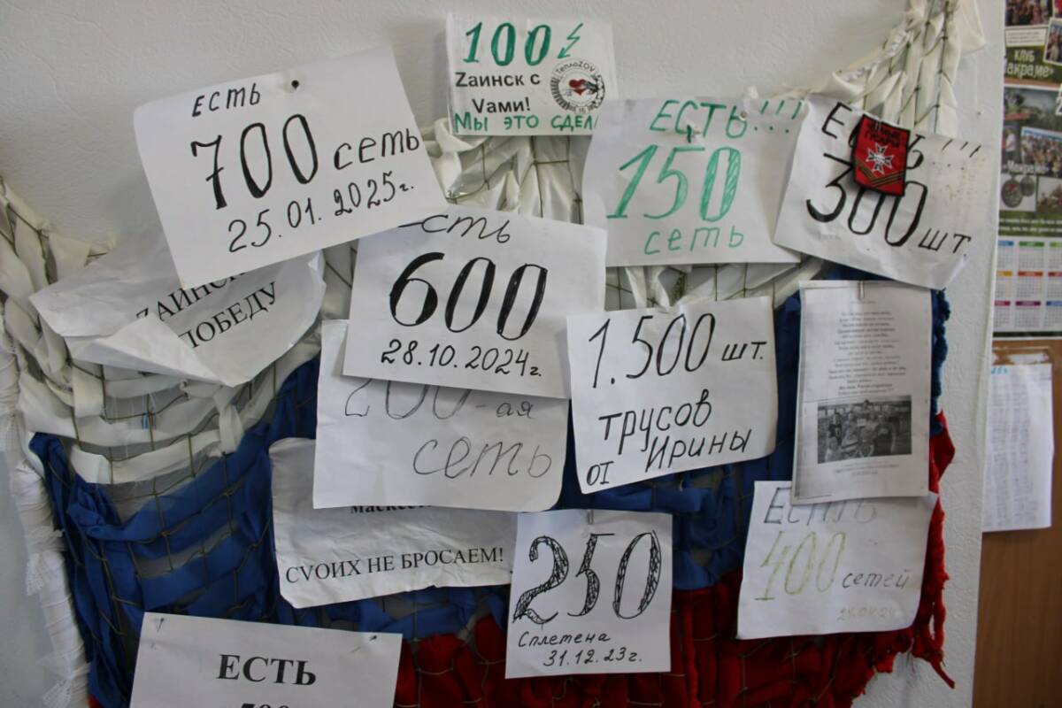 К 9 Мая 2023 года женщины создали собственный российский флаг из сетей. Его выносят на Парад Победы, а в остальное время он висит на стене цеха, украшенный датами создания юбилейных сетей. На другой стене – еще один флаг, расписанный пожеланиями и подписями бойцов.