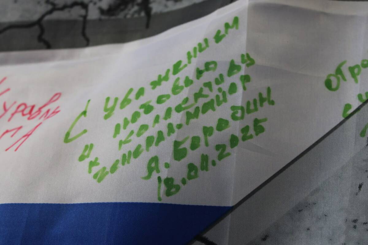 «Недавно к нам приезжал генерал-майор Александр Бородин – он тоже оставил свое пожелание на флаге. Это наша гордость», – поделились волонтеры.