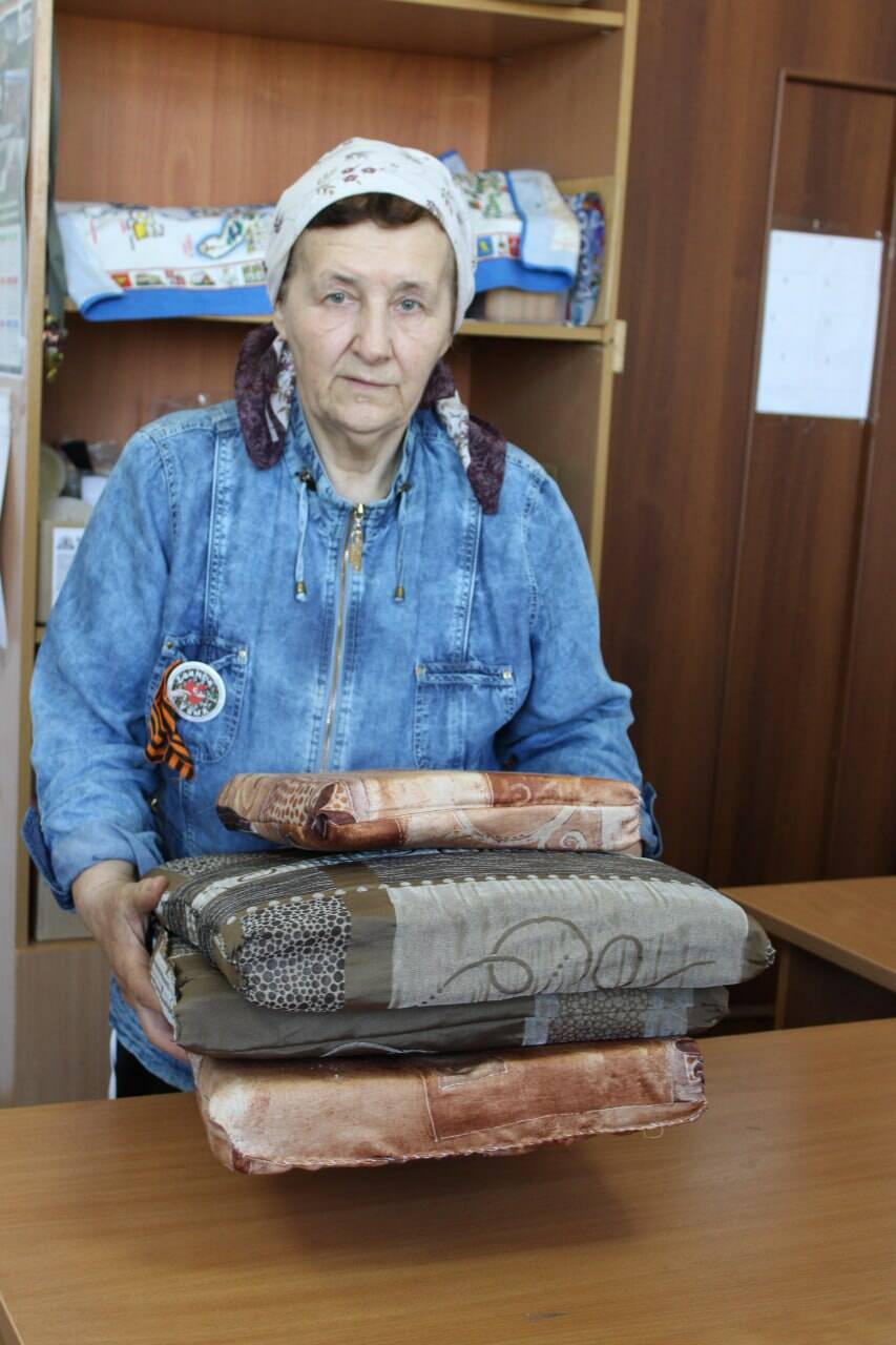Особая гордость – многофункциональные подушки, которые женщины шьют уже второй год. Их используют по-разному: подкладывают под голову, колени, локти, сидят на них, хранят в рюкзаках. Материал – эластичная ткань, даже старые шарфы и платки.