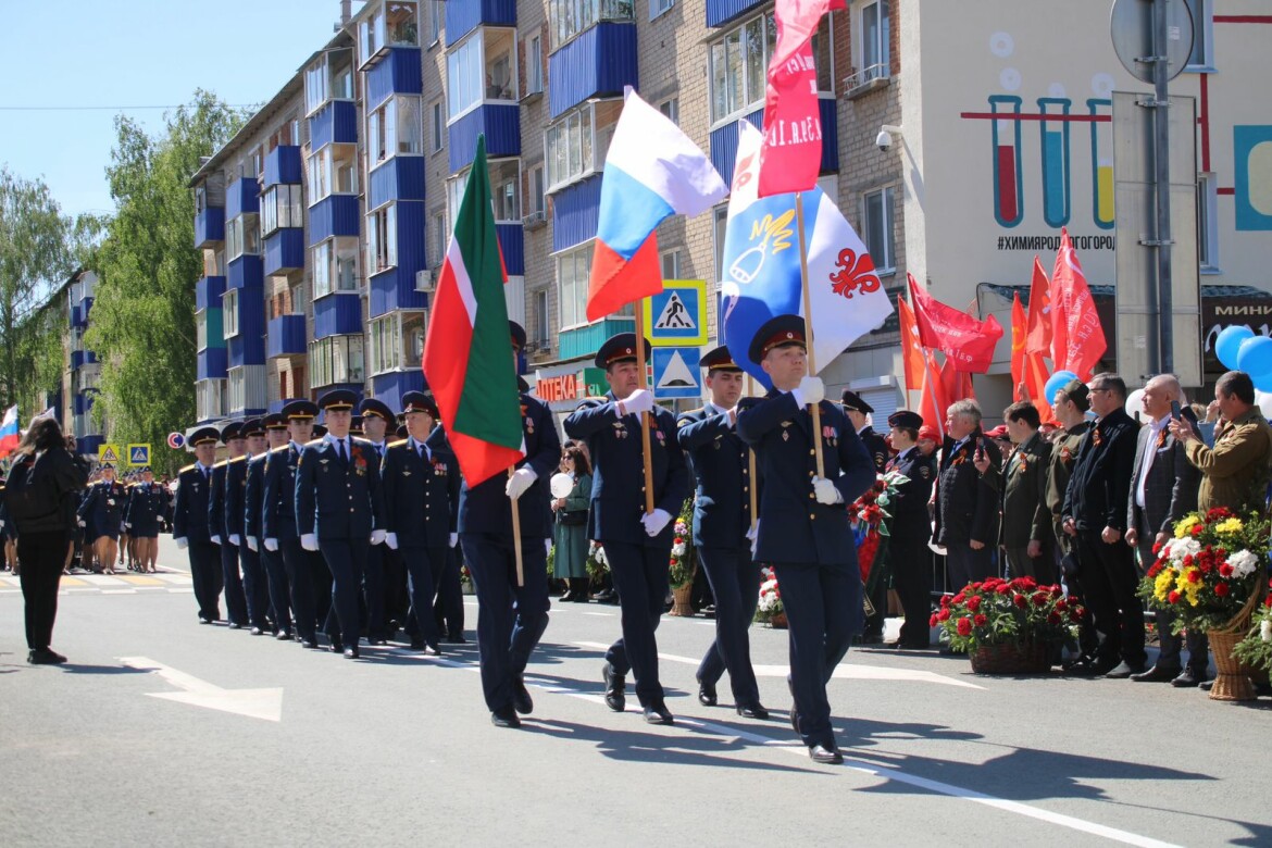 Парад открыл мужской и женский составы ФКУ ИК-10, затем прошли маршем представители Отдела МВД России по Менделеевскому району, юнармейцы и гимназисты