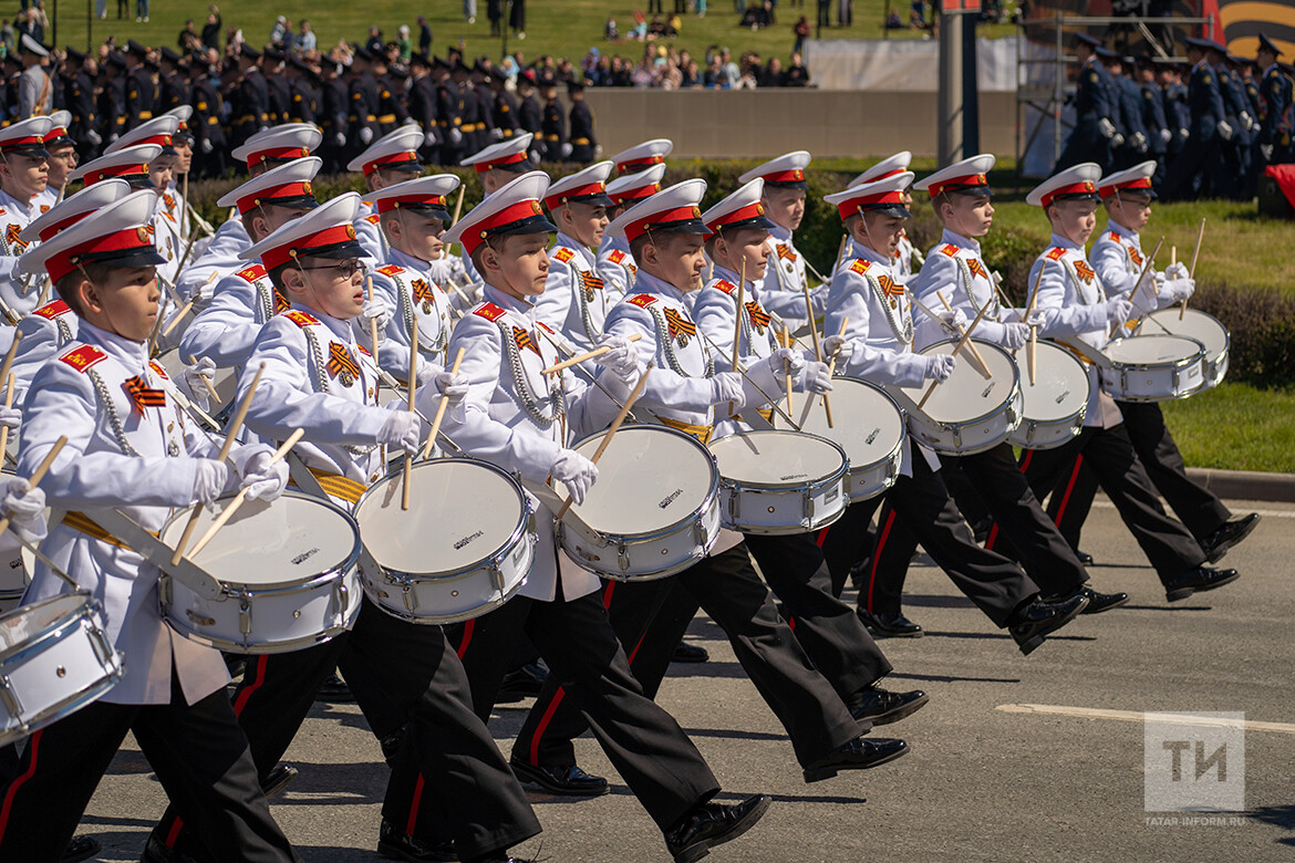 После заявления Раиса республики началось торжественное прохождение войск Казанского гарнизона. По площади прошла знаменная группа с государственными флагами России и Татарстана, а также со штандартами фронтов Великой Отечественной войны и Знаменем Победы. В параде также участвовали 24 единицы техники времен Великой Отечественной войны.