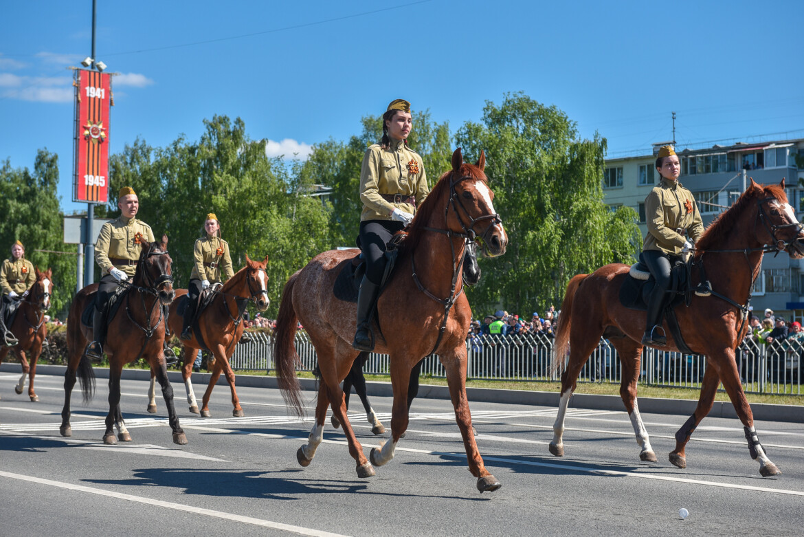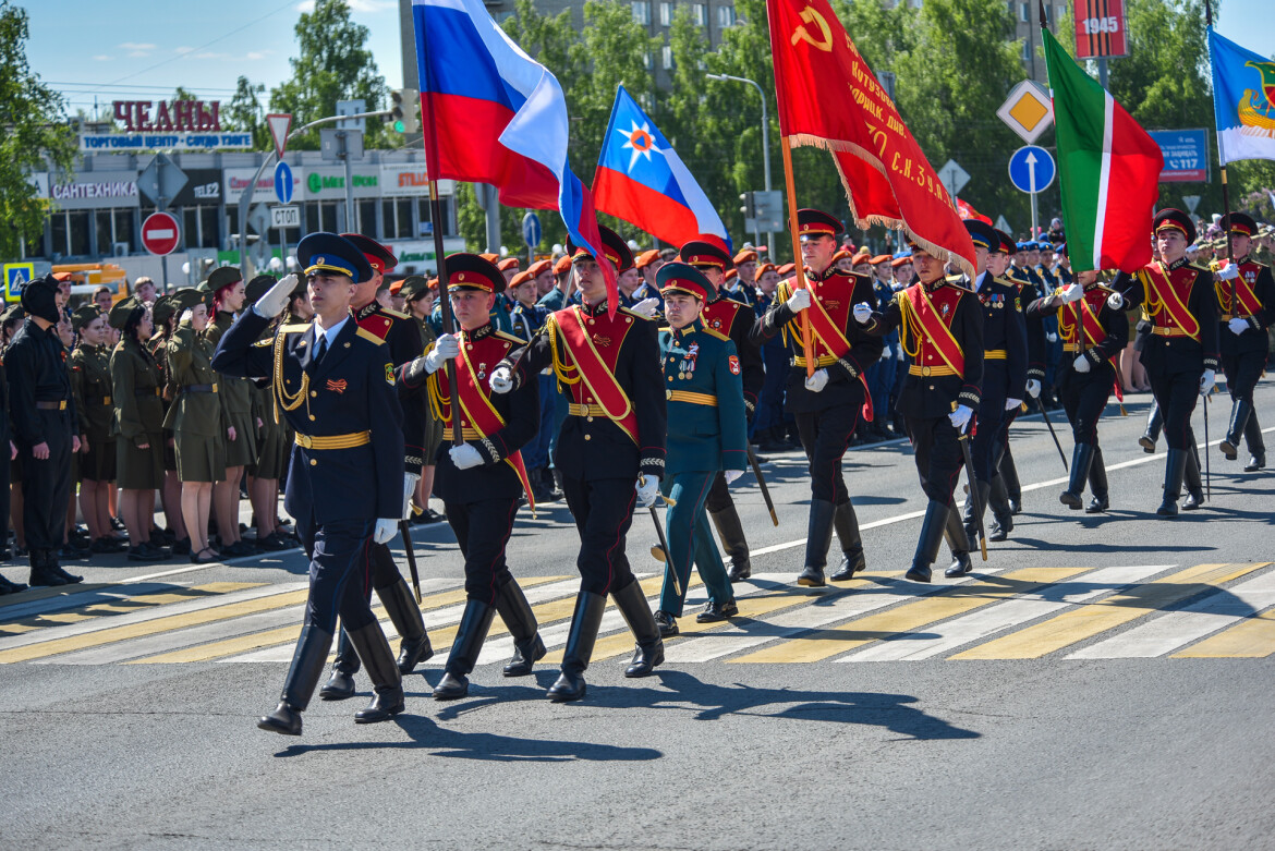 А по центральному проспекту города прошли 36 парадных расчетов. В форме пограничных войск выступили студенты Технического колледжа имени Поташова — кузницы кадров для КАМАЗа и других предприятий города. В форме танкистов времен Великой Отечественной войны прошли маршем студенты филиала Казанского инновационного университета имени Тимирясова. Принял участие в параде и расчет связисток Набережночелнинского технологического техникума, который в этом году празднует свое 50-летие. Завершили проход колонны кавалеристы.