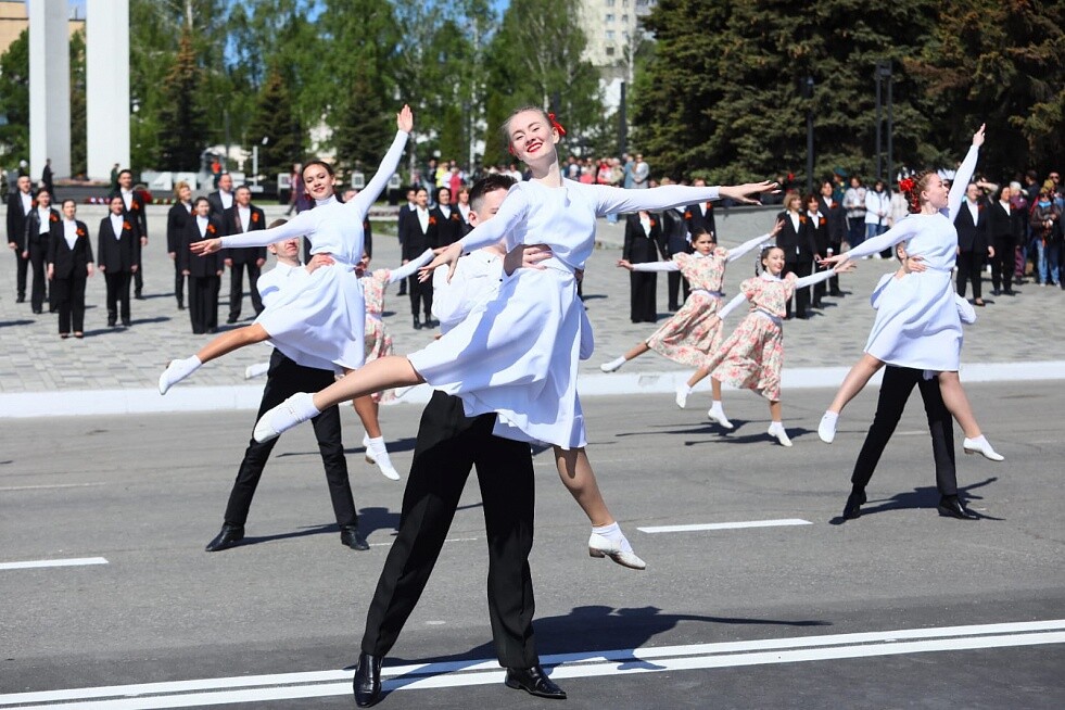 Празднование Дня Победы в Менделеевске началось театрально-хореографической постановкой на военную тематику. В этом году творческие коллективы посвятили программу в том числе и менделеевцам, участвующим в специальной военной операции на Украине.
